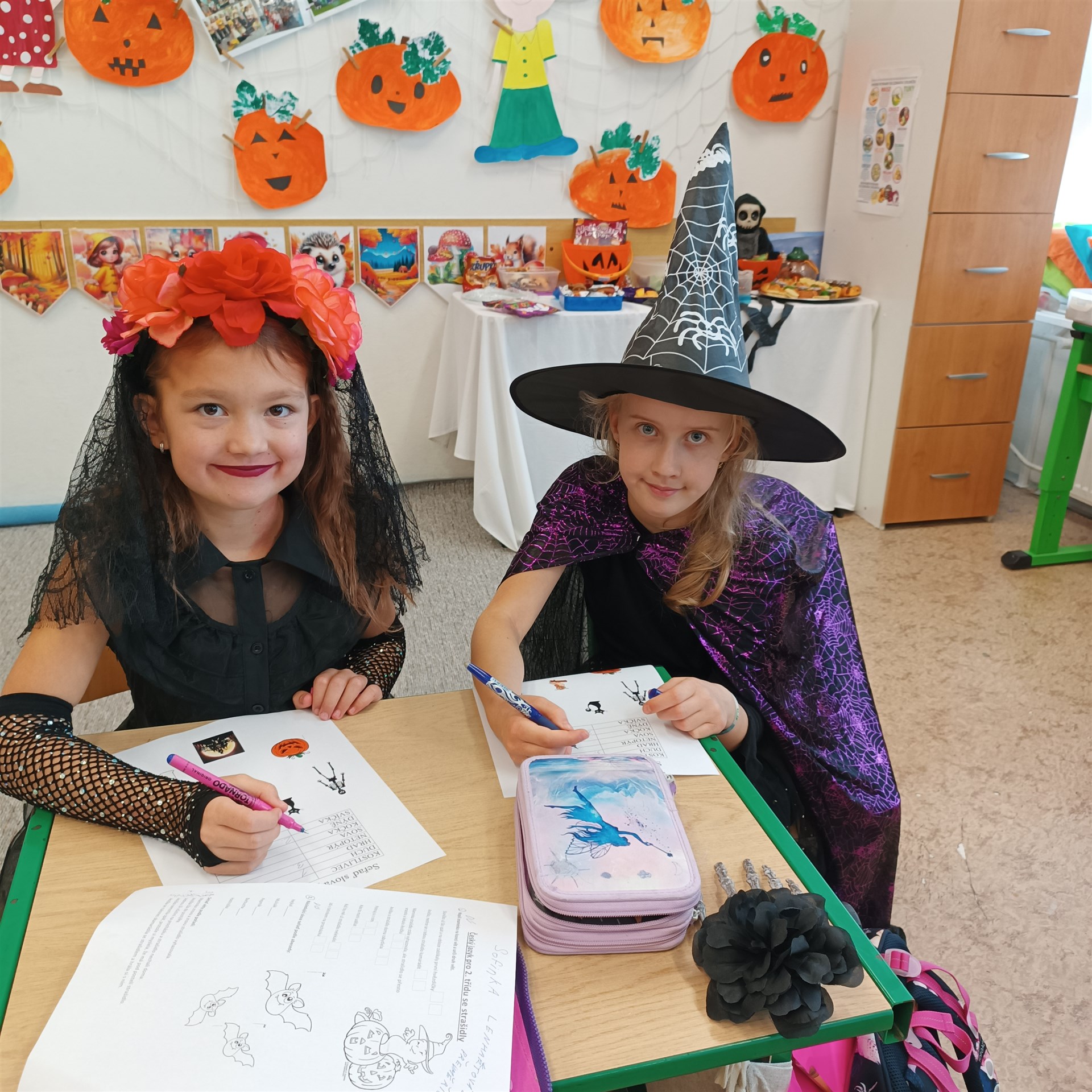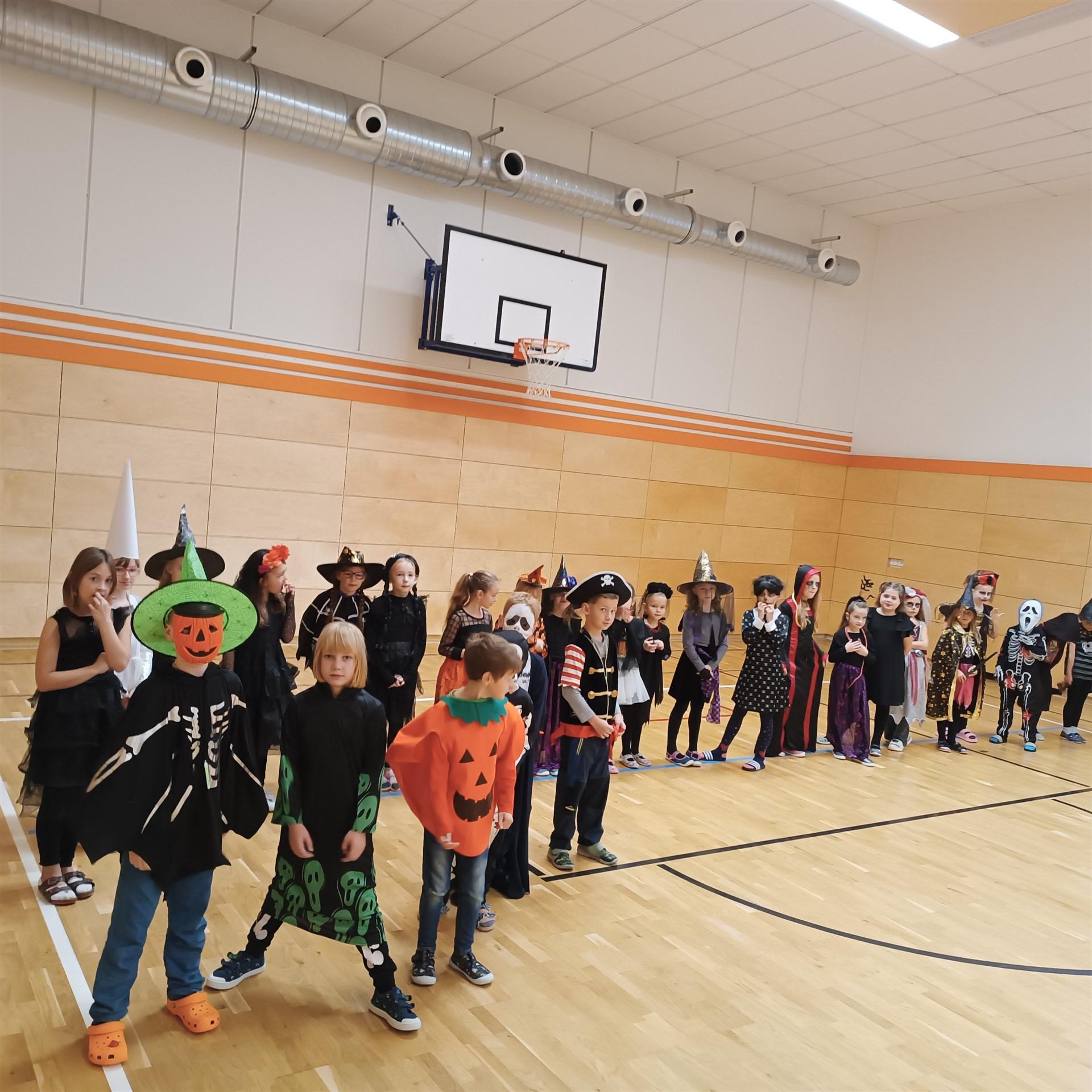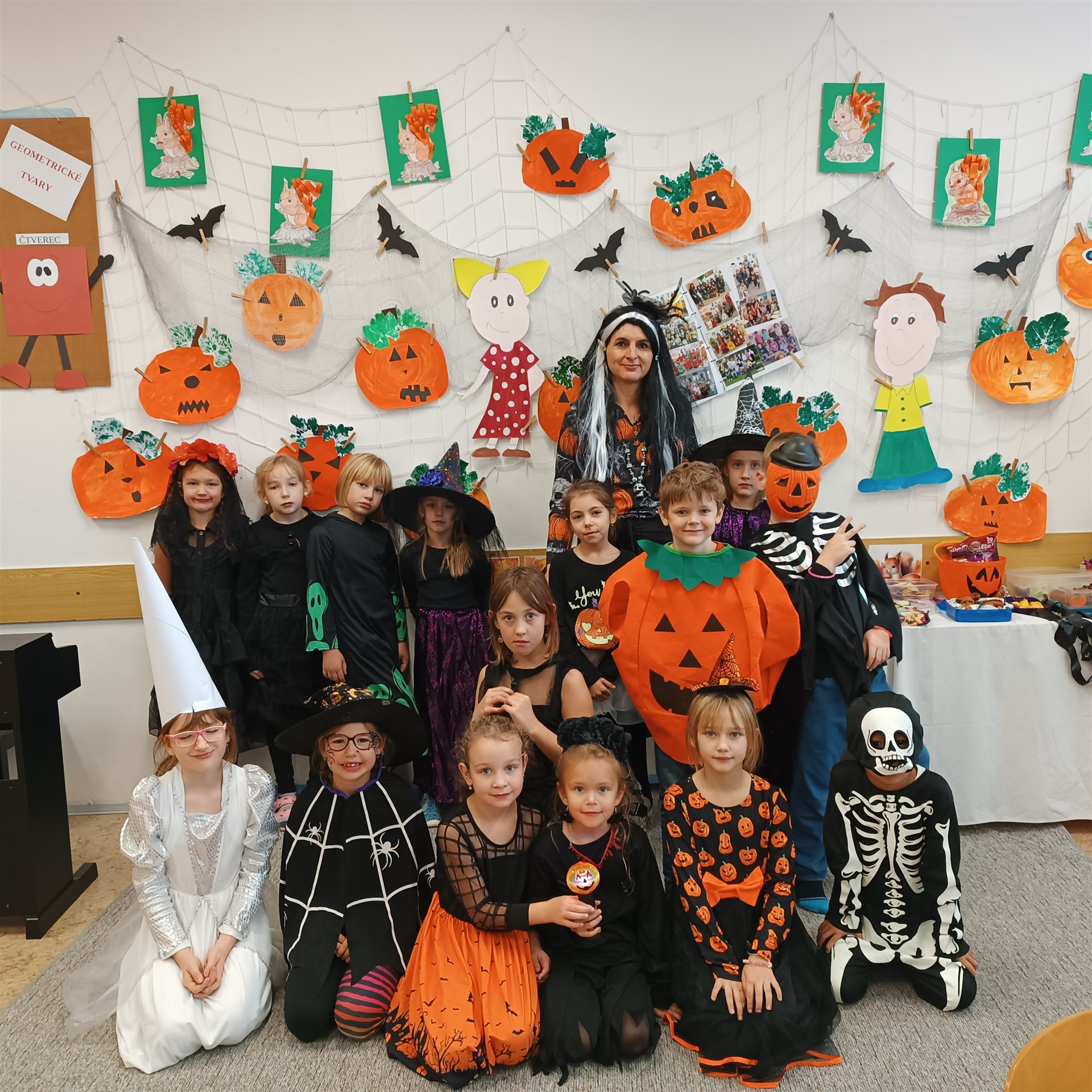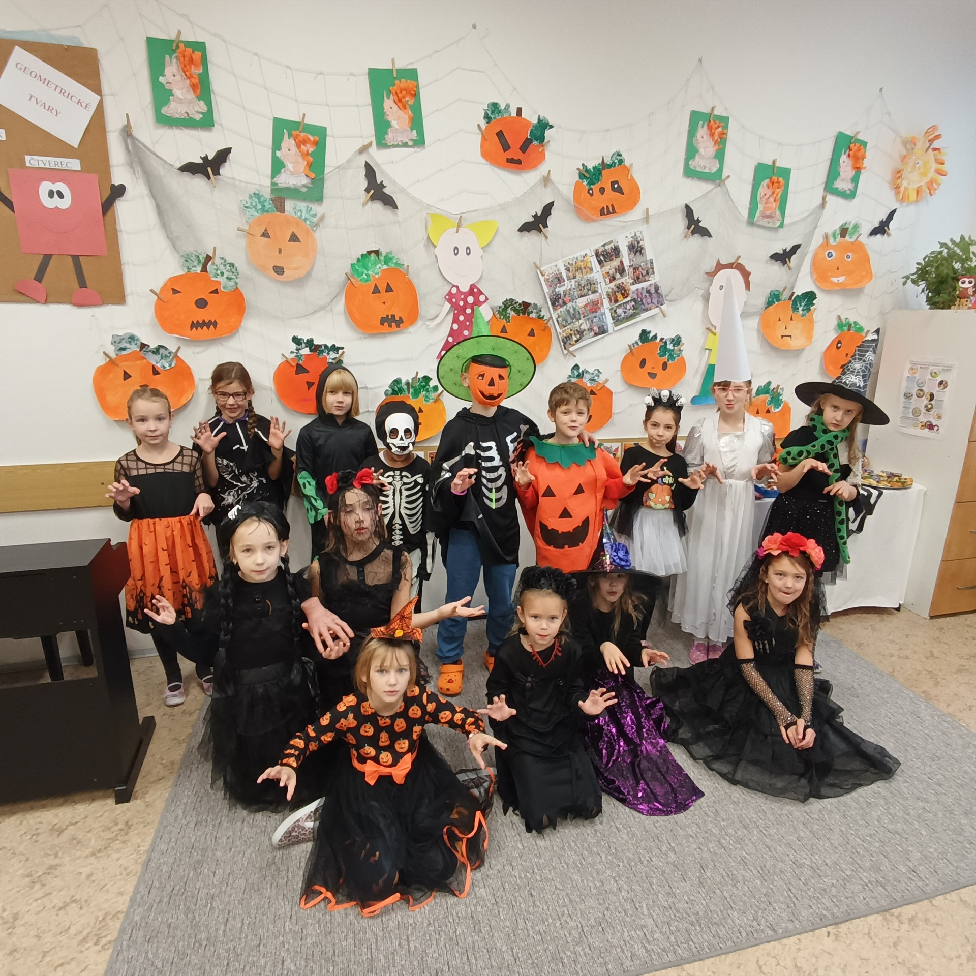 Dne 17. října přišla do druhých tříd samá strašidla. Proto vstup do třídních prostor byl jen pro otrlé a s velikou odvahou. Našli byste tady strašidla, čarodějnice, bílou paní a především také duchy a dýně. Díky šikovným maminkám nikdo netrpěl hlady. Tímto mockrát děkujeme za výbornou svačinku, po které se všechna strašidla olizovala ještě ve družině. Věděli byste, že i strašidla umí počítat, psát, číst, luštit křížovky, malovat, zpívat a dokonce i tancovat? Všechna naše strašidla toto zvládla dokonale a díky tomu obdržela strašidelný svítící náramek a hlavně kouzelné dýňové semínko, které dokáže zázraky. To je ovšem tajemstvím jen pro odměněné.