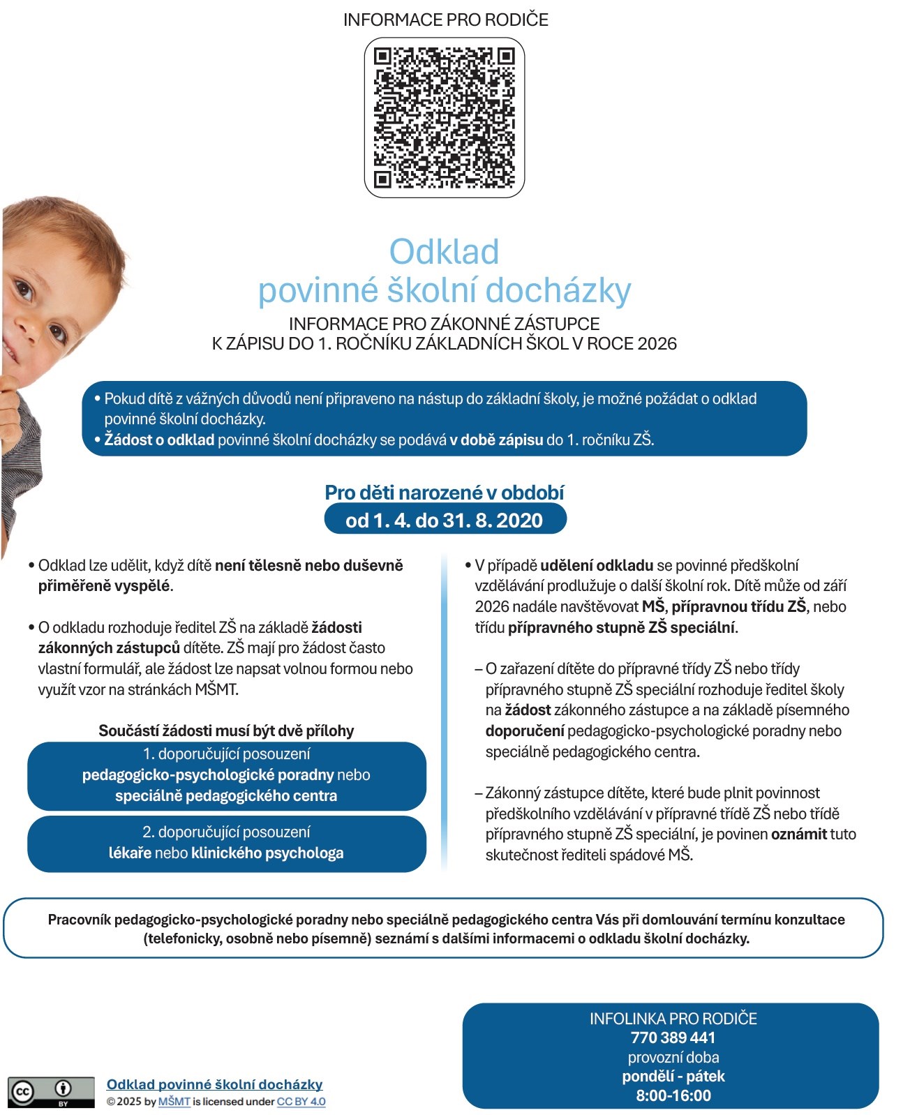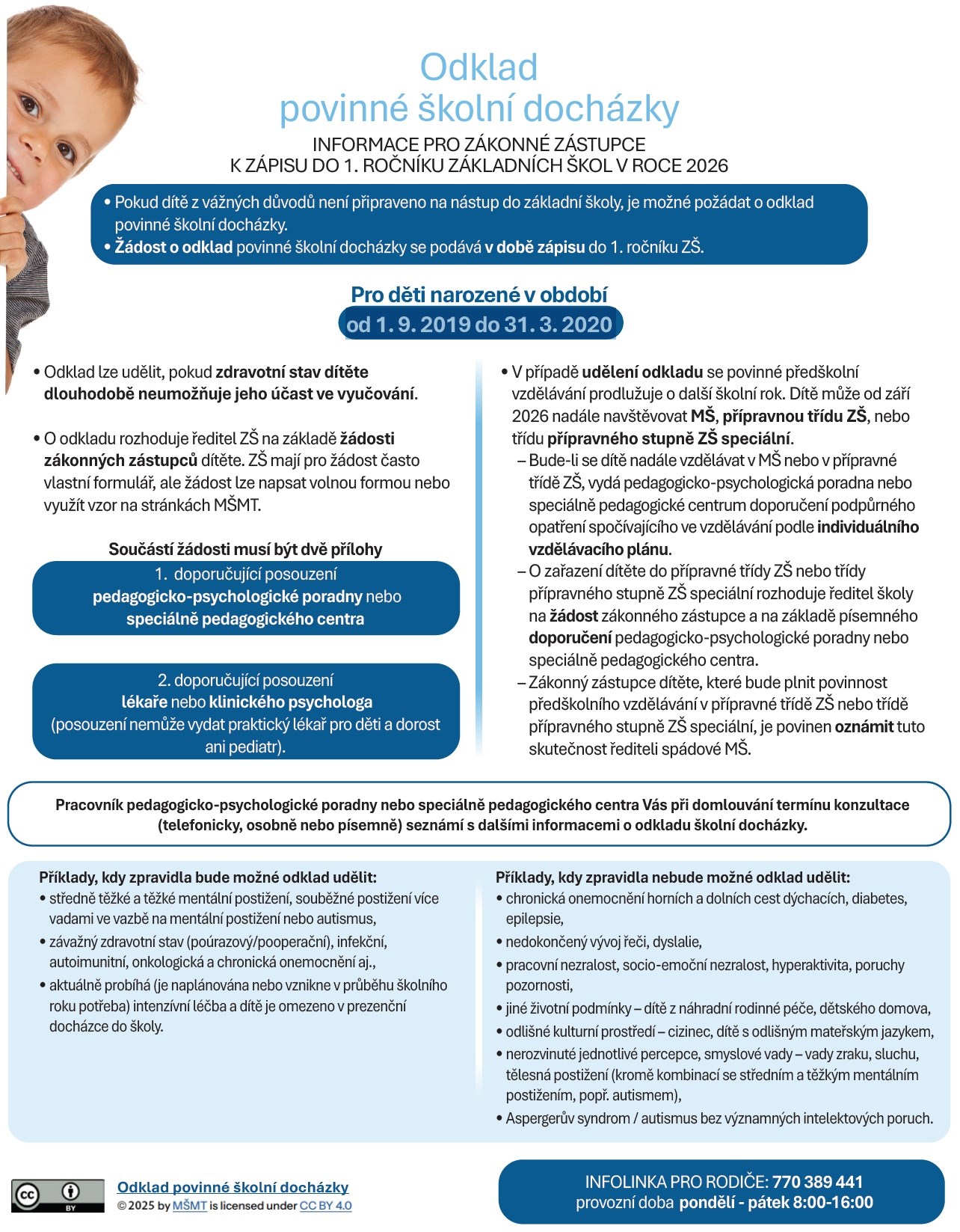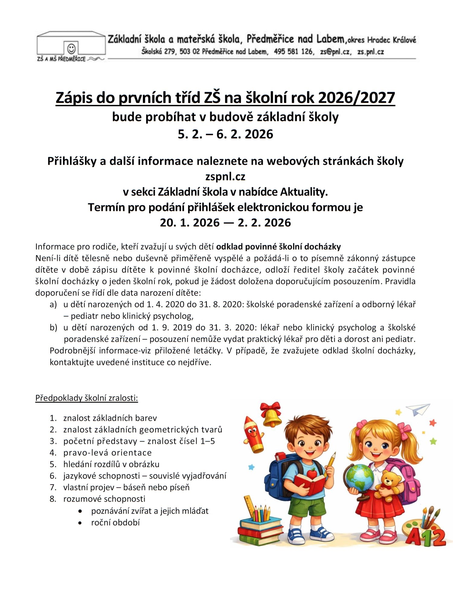 V případě, že budete žádat o odklad povinné školní docházky, přineste s sebou vytištěnou a podepsanou Žádost o odklad (pokud zvolíte zaslání e-mailem/ datovou schránkou, bude dokument nachystaný).
